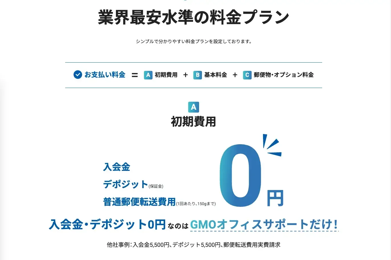 他社では初期費用5,000円〜が一般的な中、GMOオフィスサポートは初期コストを抑えて利用を始められます。