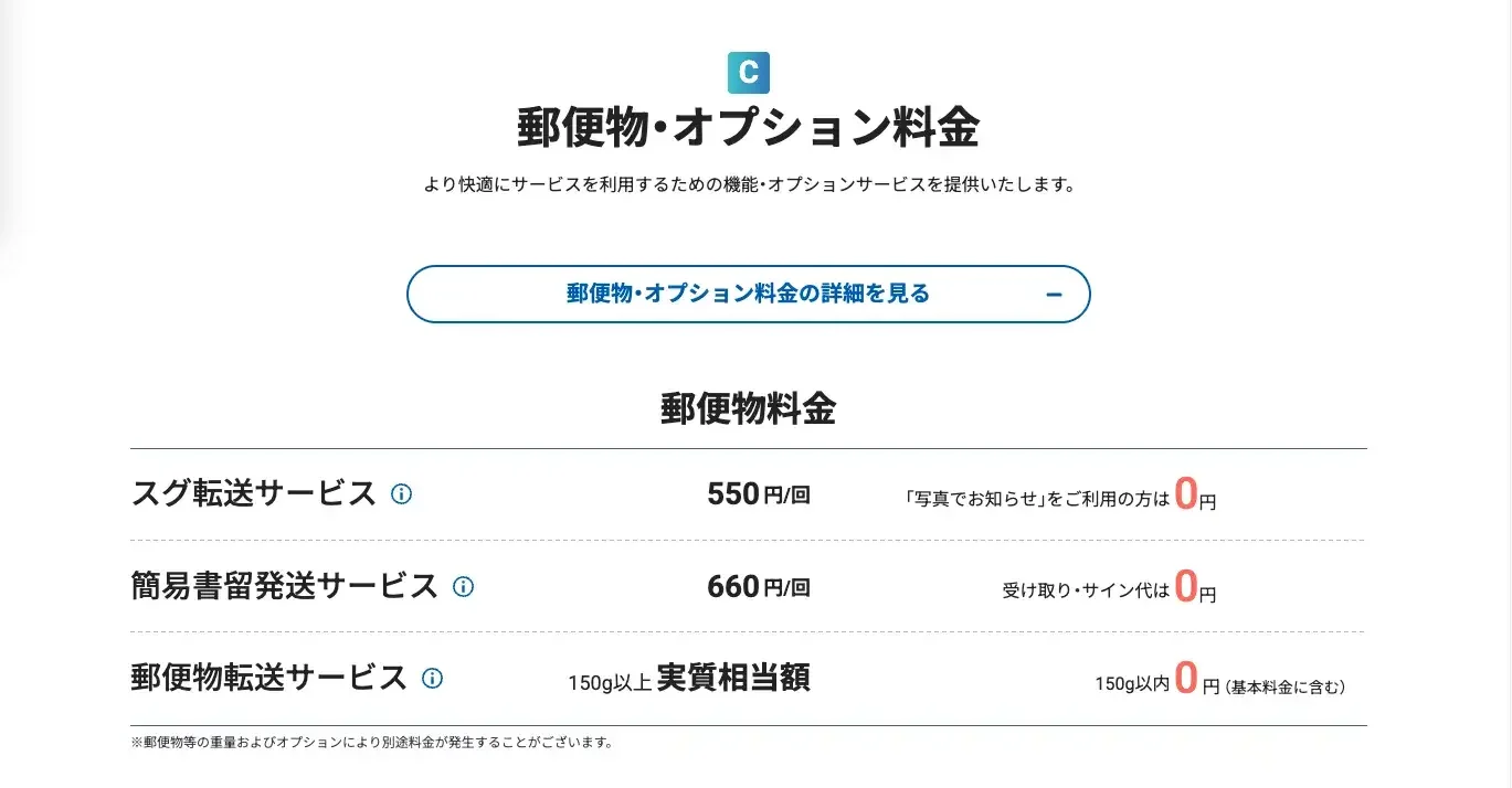 | 郵便物転送サービス | 150g以内は無料 | 150gを超える場合は実費請求 |