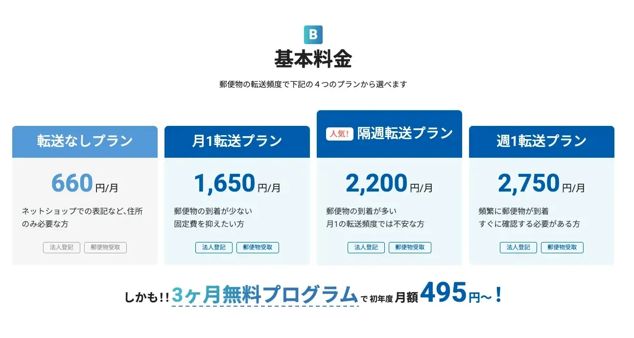 - 月1転送プラン:1,650円/月(郵便が少ない方向け)