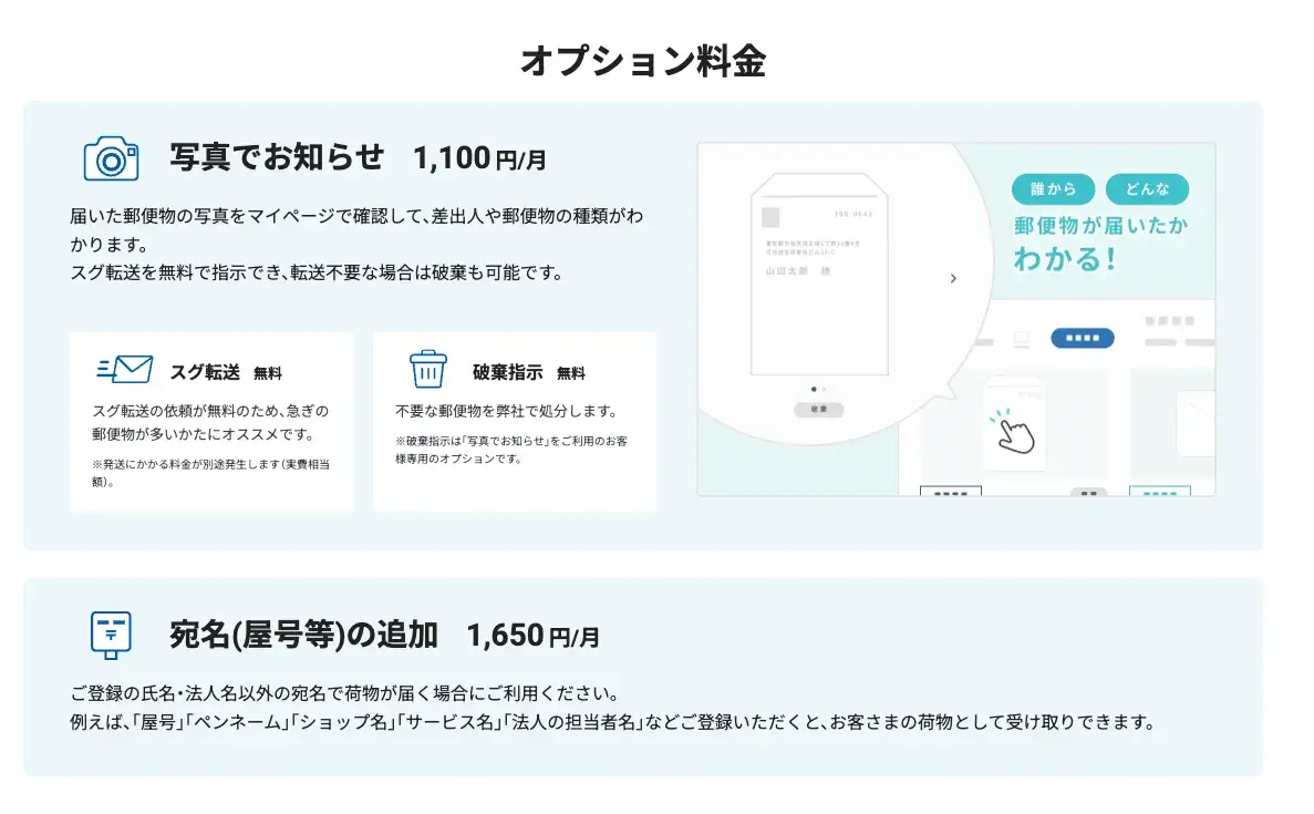 郵便物の転送や書類発送など、より快適に利用できるオプションも充実しています。