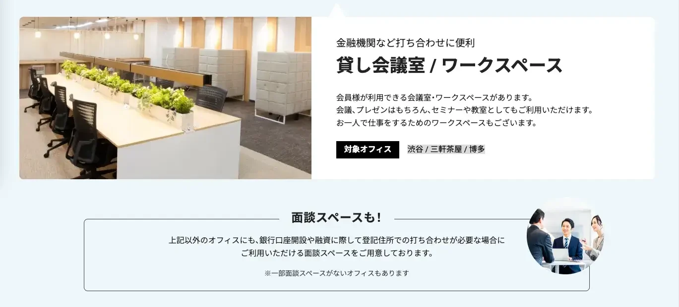銀行口座開設や融資に関する面談など、登記住所での打ち合わせが必要な場合に利用できる面談スペースも用意されています。