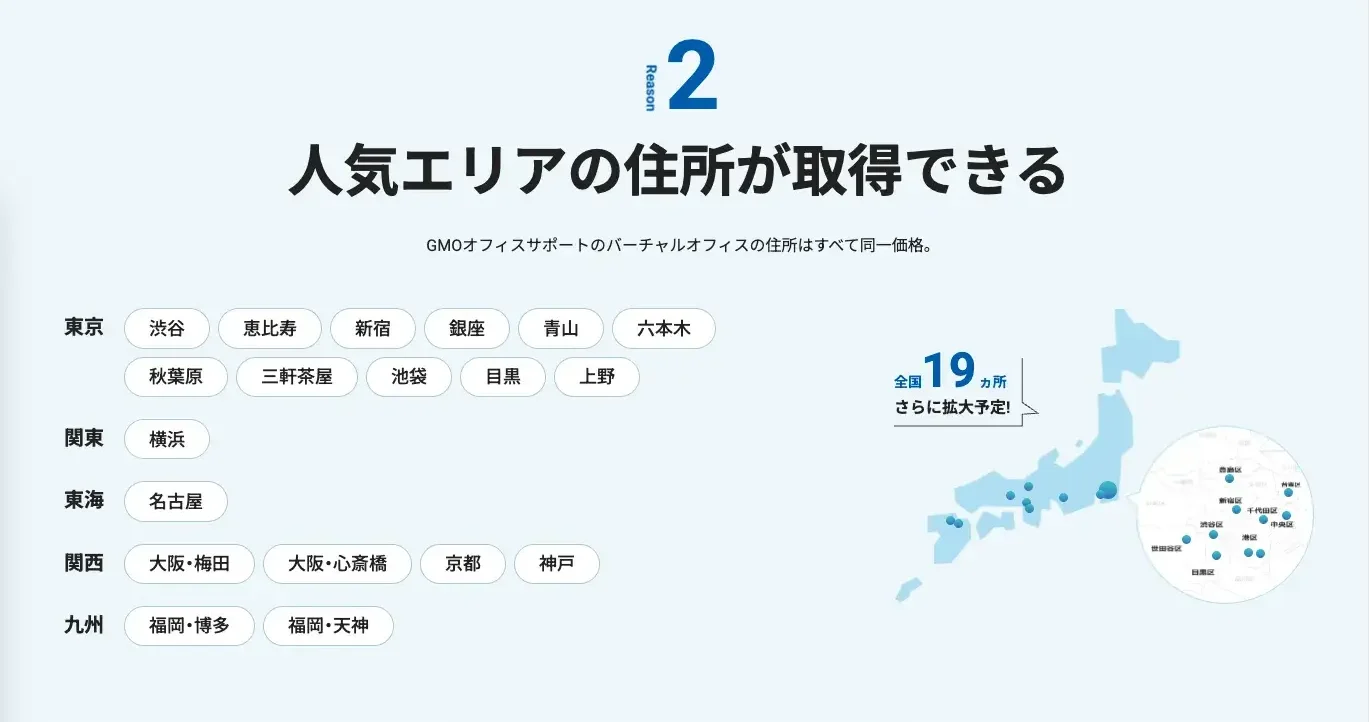 GMOオフィスサポートのバーチャルオフィスでは、全国の主要都市に拠点を展開。