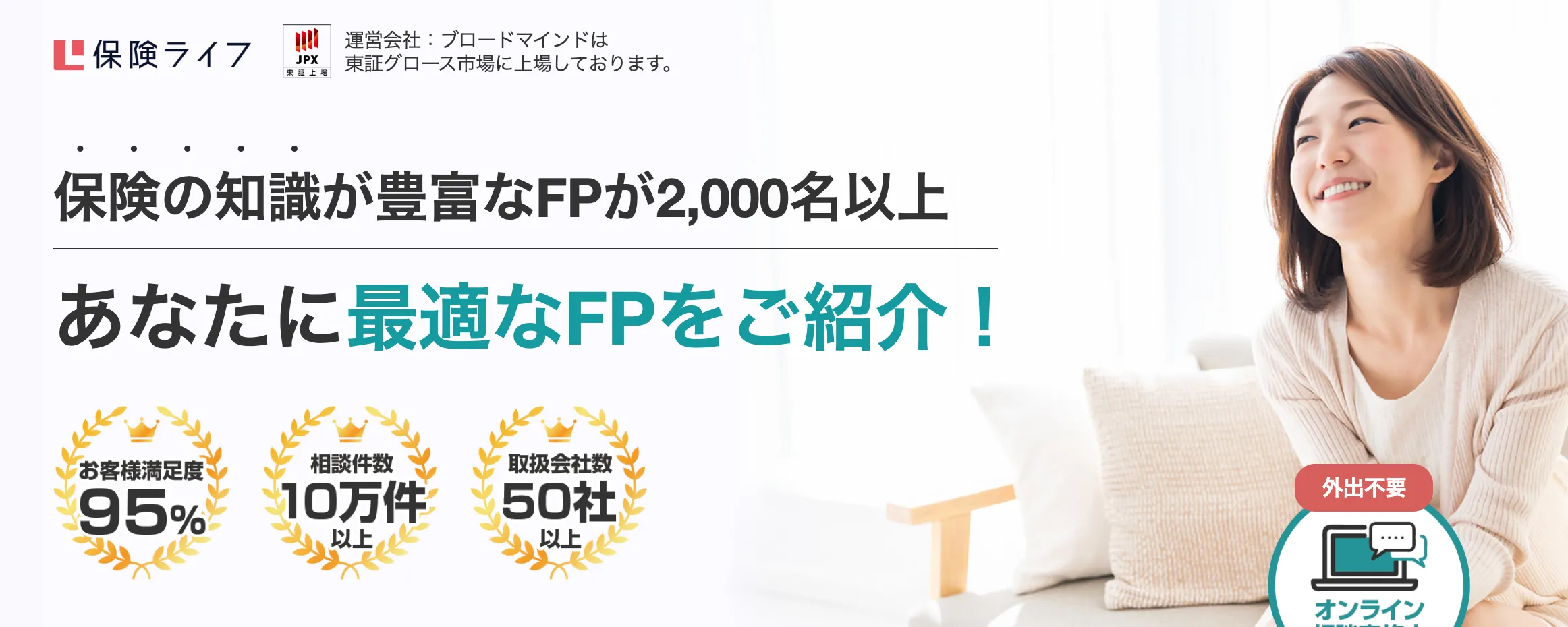 保険ライフは、創業20年以上・東証グロース市場上場企業が運営する無料保険相談サービスです。相談満足度95%、紹介可能なFP2,000名以上、取扱保険会社最大50社以上と実績も豊富で、保険の見直しから資産形成まで幅広く相談できます。