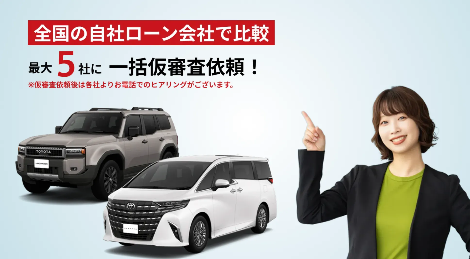 「ローン審査に落ちて車を諦めかけている…」そんな方に注目されているのが、自社ローンの窓口です。全国の自社ローン取扱店へまとめて仮審査依頼ができ、通る可能性がある販売店を効率よく探せます。