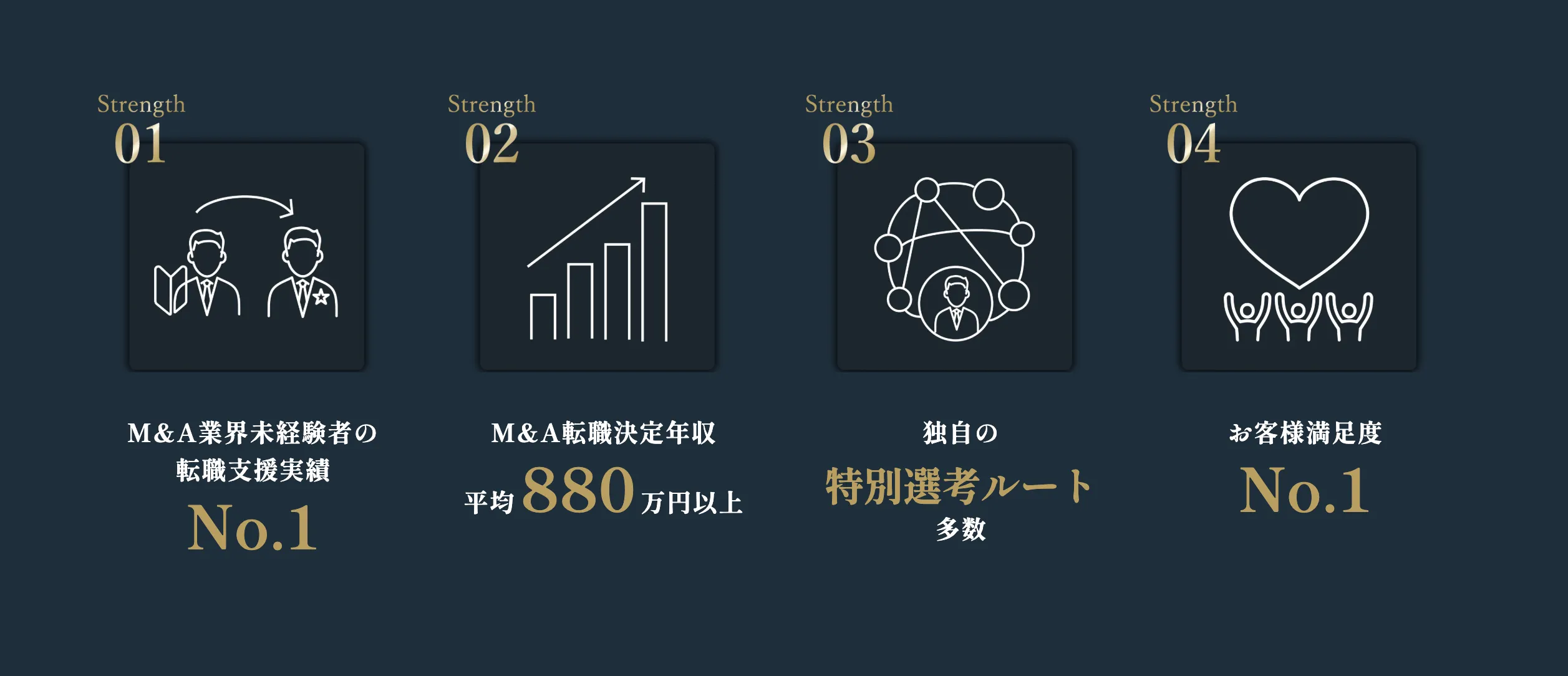 特に注目すべきは、最難関M&A仲介会社における内定率50%という高い実績と、転職決定後の平均年収880万円以上という業界トップクラスの成果です。さらに、M&A業界未経験者の転職支援実績No.1や顧客満足度No.1など、実績面でも高く評価されています。