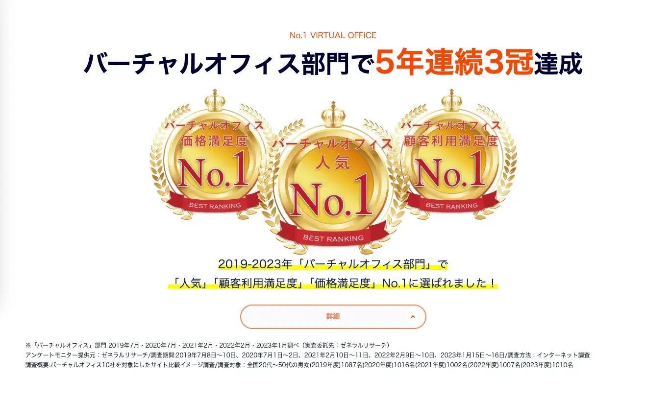 この結果は、ゼネラルリサーチによるインターネット調査(バーチャルオフィス10社比較)で明らかになったもので、5年連続で3冠を達成しているのは業界でも非常に稀な実績です。