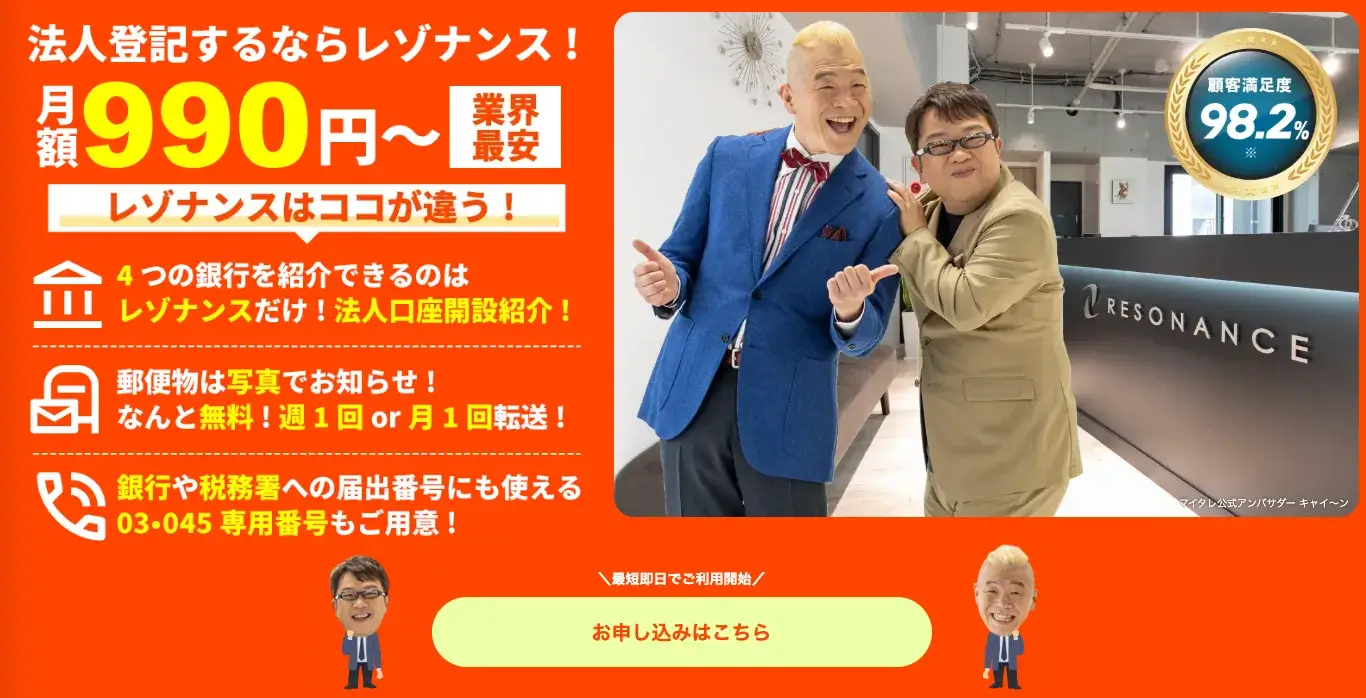 バーチャルオフィスの中でも「990円で法人登記できる」と話題のレゾナンス(RESONANCE)。