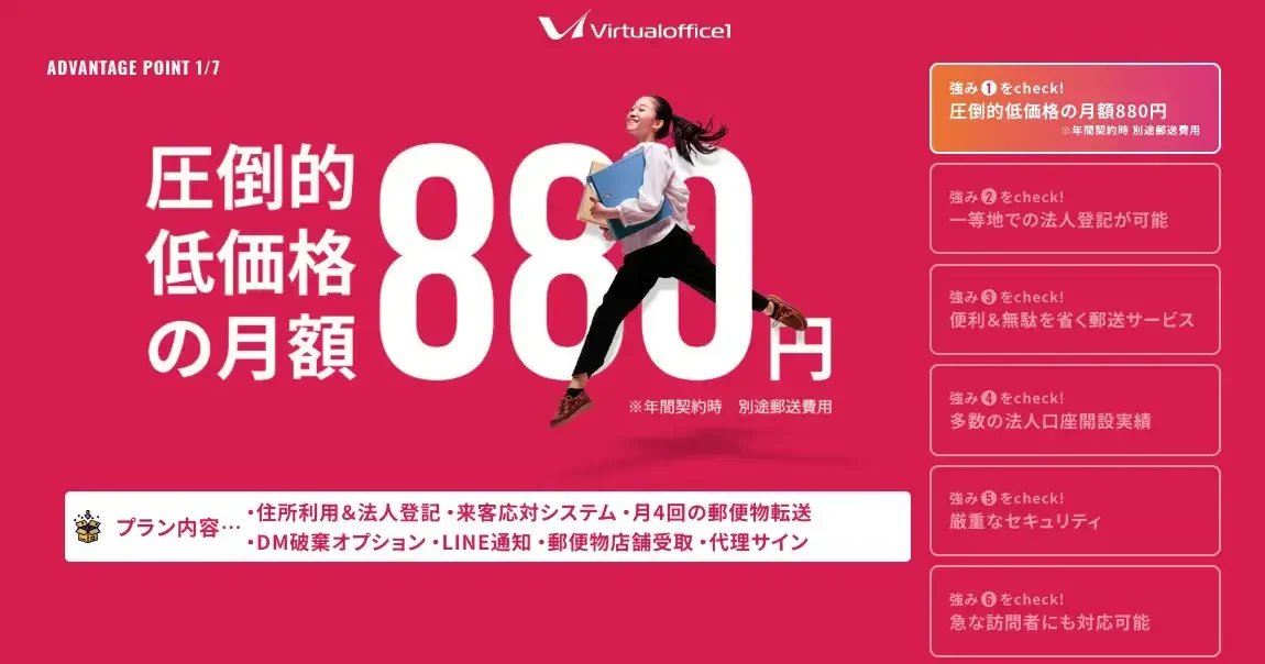 バーチャルオフィス1は、月額880円で一等地住所を利用できる業界屈指の格安サービス。