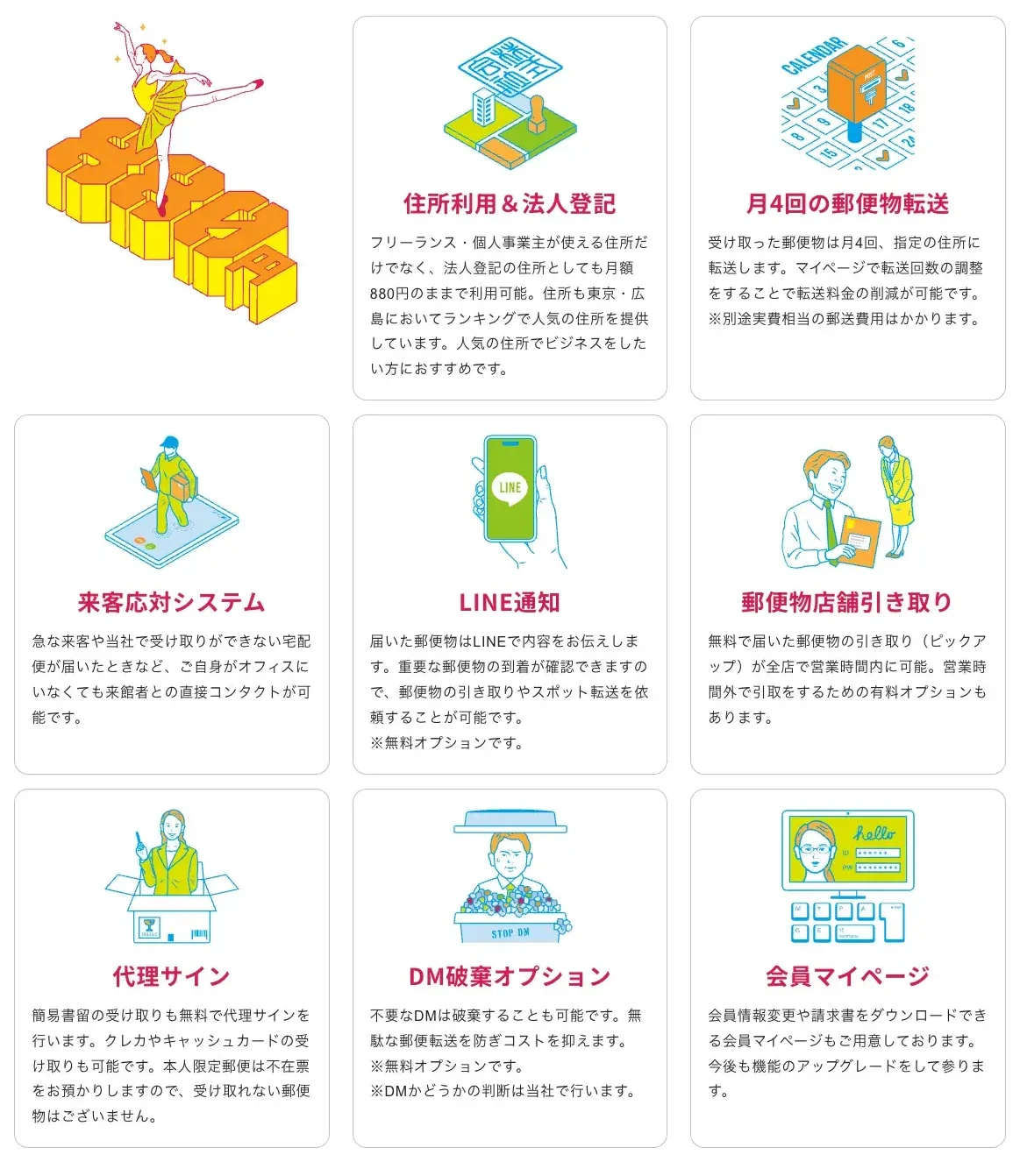 同梱サービス 住所利用/法人登記/週1転送/LINE通知/来客対応システム/DM破棄OP