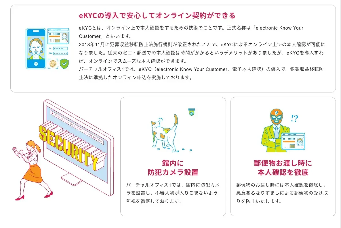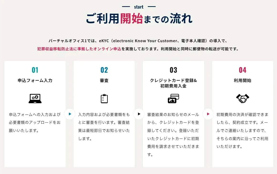 バーチャルオフィス1では、eKYC(electronic Know Your Customer:電子本人確認)を導入し、犯罪収益移転防止法に準拠したオンライン申込を実施しています。申込から利用開始までの流れは非常にシンプルで、最短で即日利用も可能です。