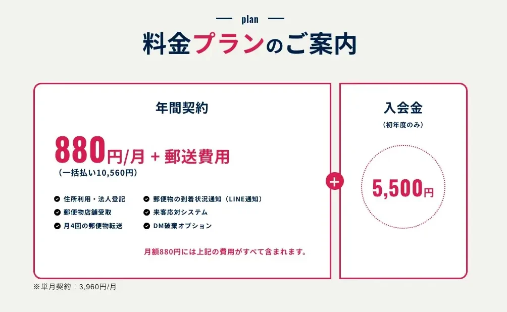 基本は年契880円/月+重量別の実費郵送費、初年度入会金5,500円だけ—急ぎや時間外はオプションを足すだけでムダを出さずに運用できます。